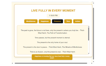 这些名言强调在每一刻充分生活的重要性,促进对日常生活的冥想方法。通过鼓励用户固定他们的思想并欣赏现在的消息,这个工具作为一个温和的提醒,让人们放慢脚步,找到内心的平静。非常适合任何希望培养正念的人,"在每一刻充分生活"通过促进与此时此刻的更深连接来丰富用户体验。